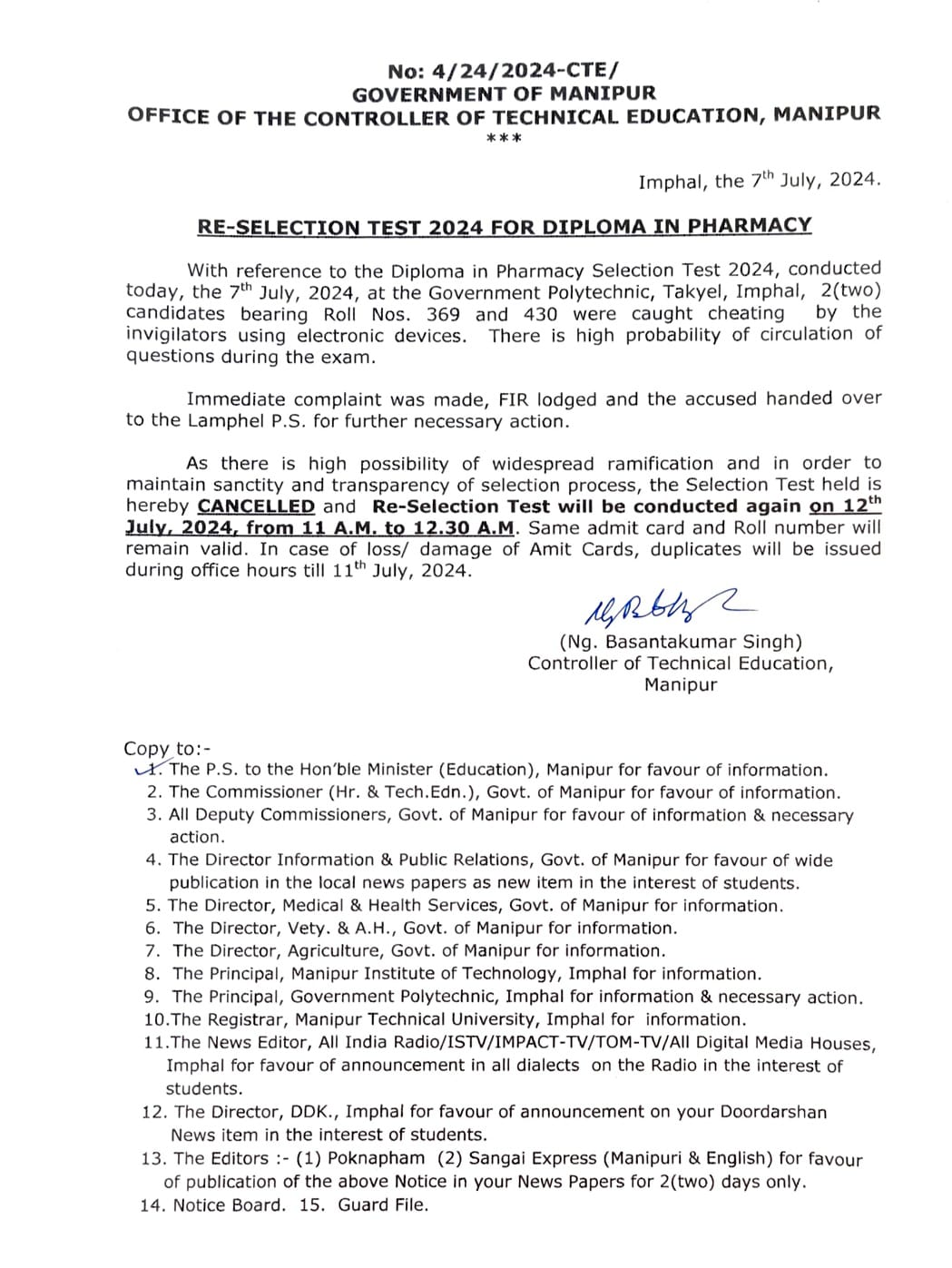 - Re selection test for Diploma in Pharmacy.New
